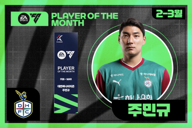 한국프로축구연맹은 21일 "대전하나시티즌 주민규가 K리그 공식 비디오게임 파트너 일렉트로닉아츠(이하 'EA')가 후원하는 2025년 첫 'EA SPORTS 이달의 선수상'을 수상했다"라고 밝혔다.