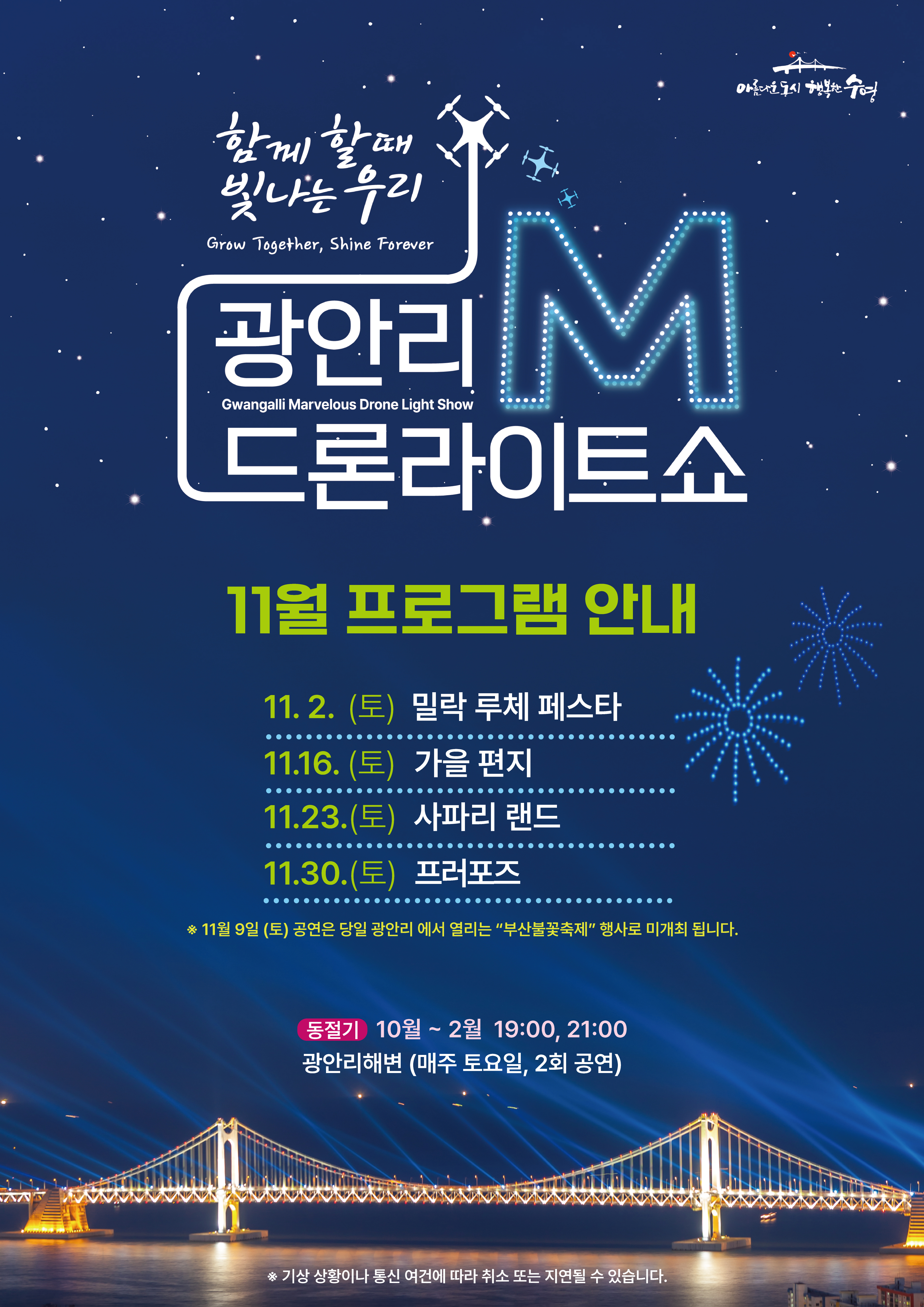 부산 광안리에서 펼쳐지는 장관이 11월에 다시 돌아옵니다! 관람 포인트와 예약 꿀팁만 알면 최고의 자리에서 감상할 수 있습니다. 지금 바로 확인하고 11월 일정을 미리 체크하세요.