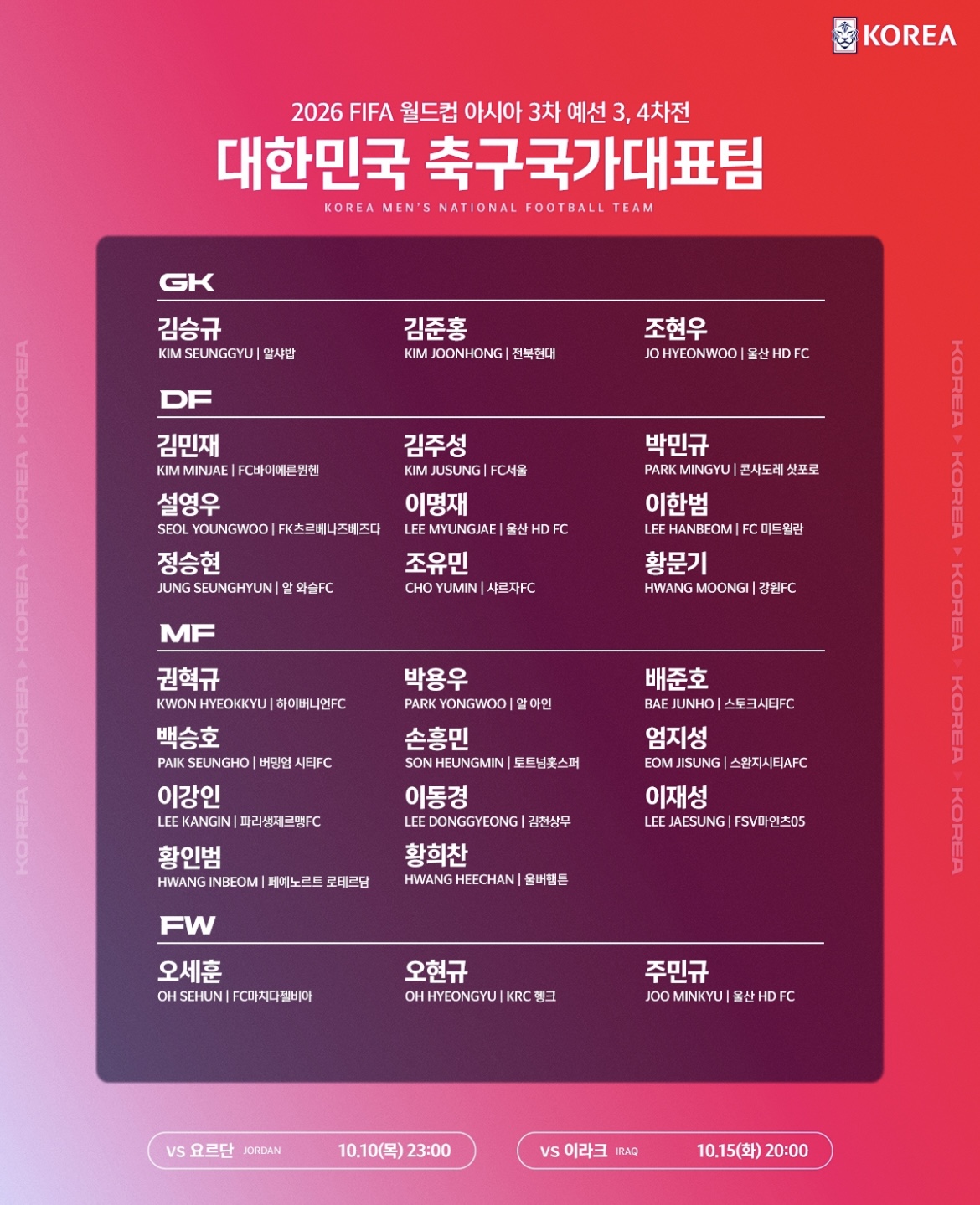 대한민국 vs 이라크 (10/15 화 20:00) 홈