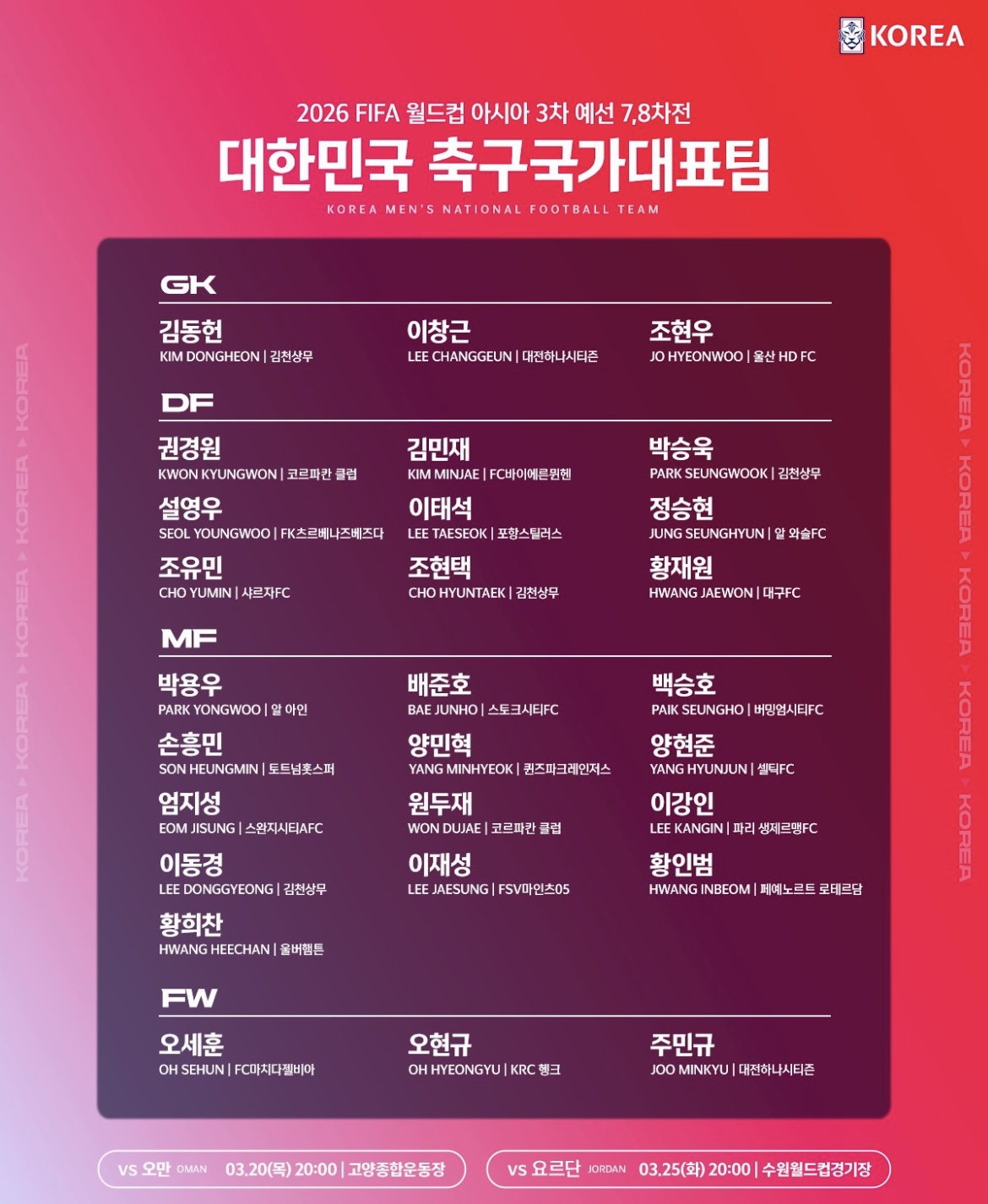 이강인(파리 생제르맹), 손흥민(토트넘), 양민혁(QPR), 엄지성(스완지시티), 이동경(김천상무), 홍현석(마인츠), 양현준(셀틱), 황희찬(울버햄튼)