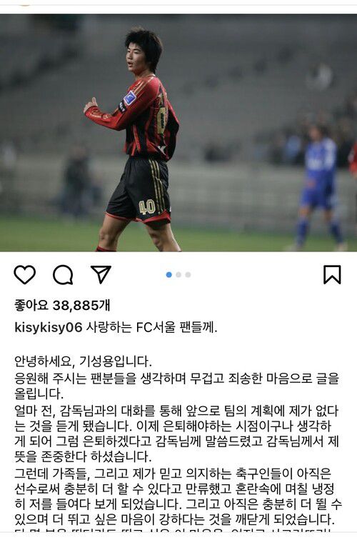 기성용은 에스엔에스 글을 통해, “(김기동) 감독님과의 대화를 통해, 이제 은퇴해야 하는 시점이구나 생각했”지만, 이어 심경이 달라진 상황을 알렸다.